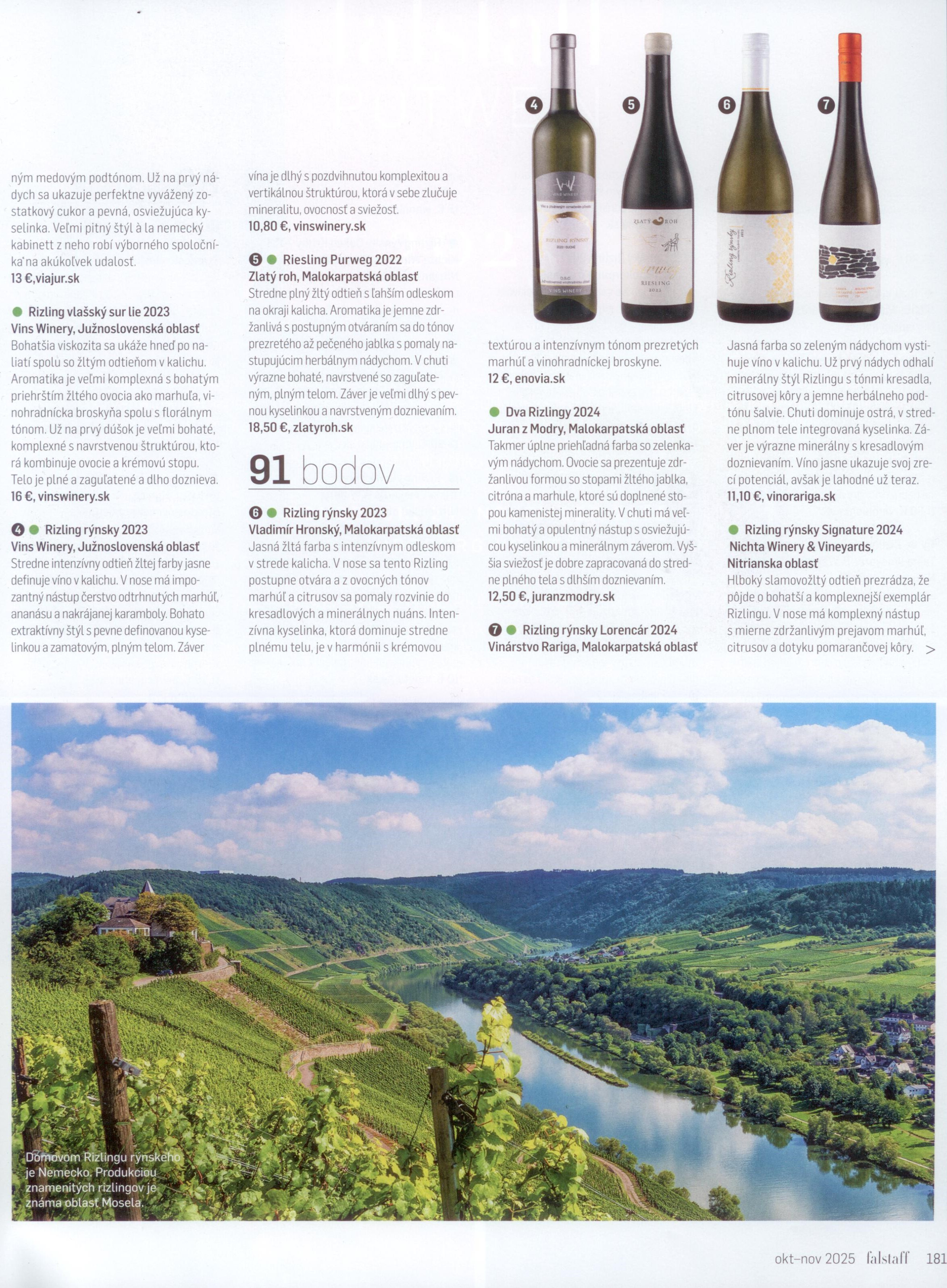 O tom, že skvelé Rizlingy rýnske sú dostupné aj na Slovensku svedčí ďalšie ocenenie nášho ročníka 2023. V minulom roku zažiaril na AWC VIENNA zlatou medailou (90,3 bodov) a nedávno na RIZLING TROPHY v časopise Falstaff Slovensko hodnotením 91 bodov. Čo o našom Rizlingu rýnskom posudzovatelia napísali? "Jasná žltá farba s intenzívnym odleskom v strede kalicha. V nose sa tento Rizling postupne otvára a z ovocných tónov marhúľ a citrusov sa pomaly rozvinie do kresadlových minerálnych nuáns. Intenzívna kyselinka, ktorá dominuje stredne plnému telu, je v harmónii s krémovou textúrou a intenzívnym tónom prezretých marhúľ a vinohradníckej broskyne."